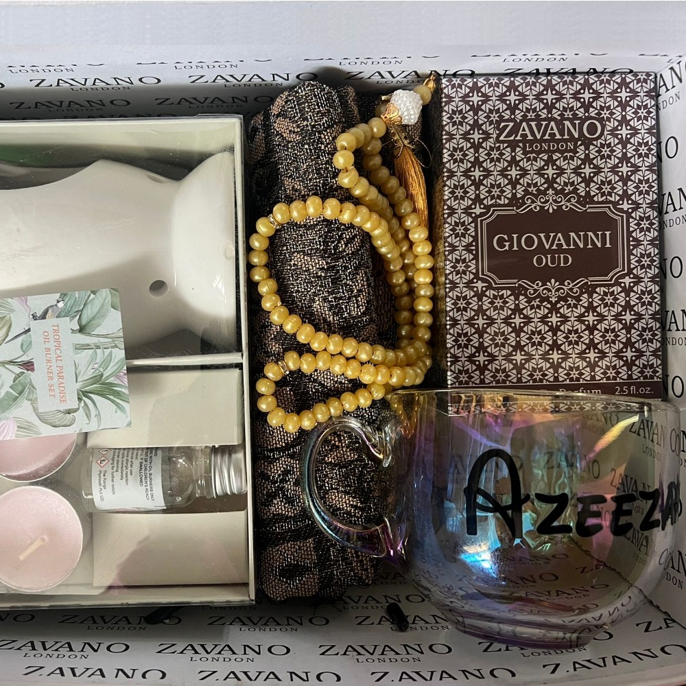 This package includes our signature fragrance and other unique products that are perfect for the occasion. We’ve carefully curated a set that includes a prayer mat, Tesbih, customised mug and candle burner set. Each of these products complements our perfume and adds to the overall experience.